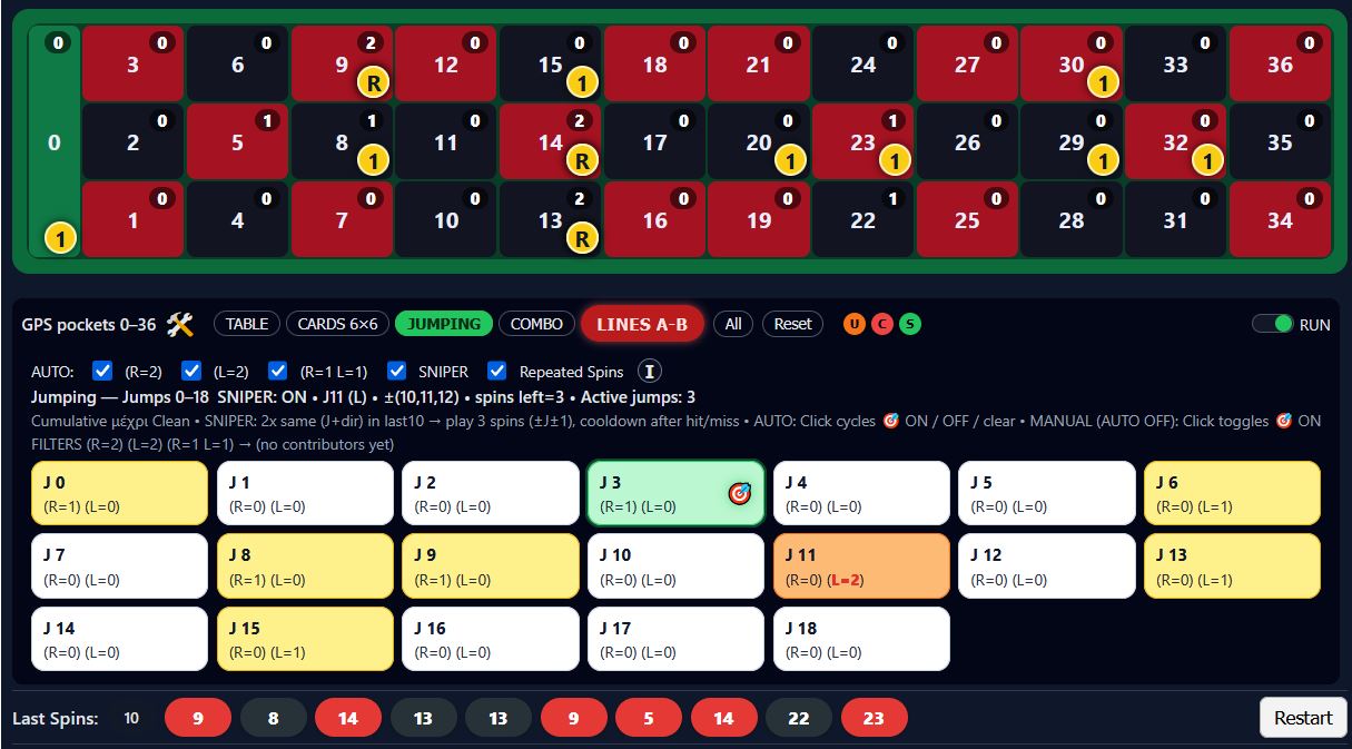 GPS Pockets – JUMPING is a real-time roulette strategy system built on wheel-distance tracking. Instead of analysing spins as isolated results, it measures how far the ball “jumps” from one pocket to the next and in which direction — converting live play into structured jump signals (J0–J18).